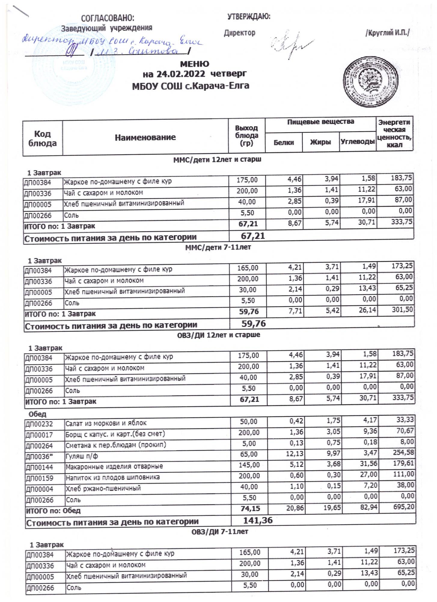 (Меню на 24 февраля 2022 г.)