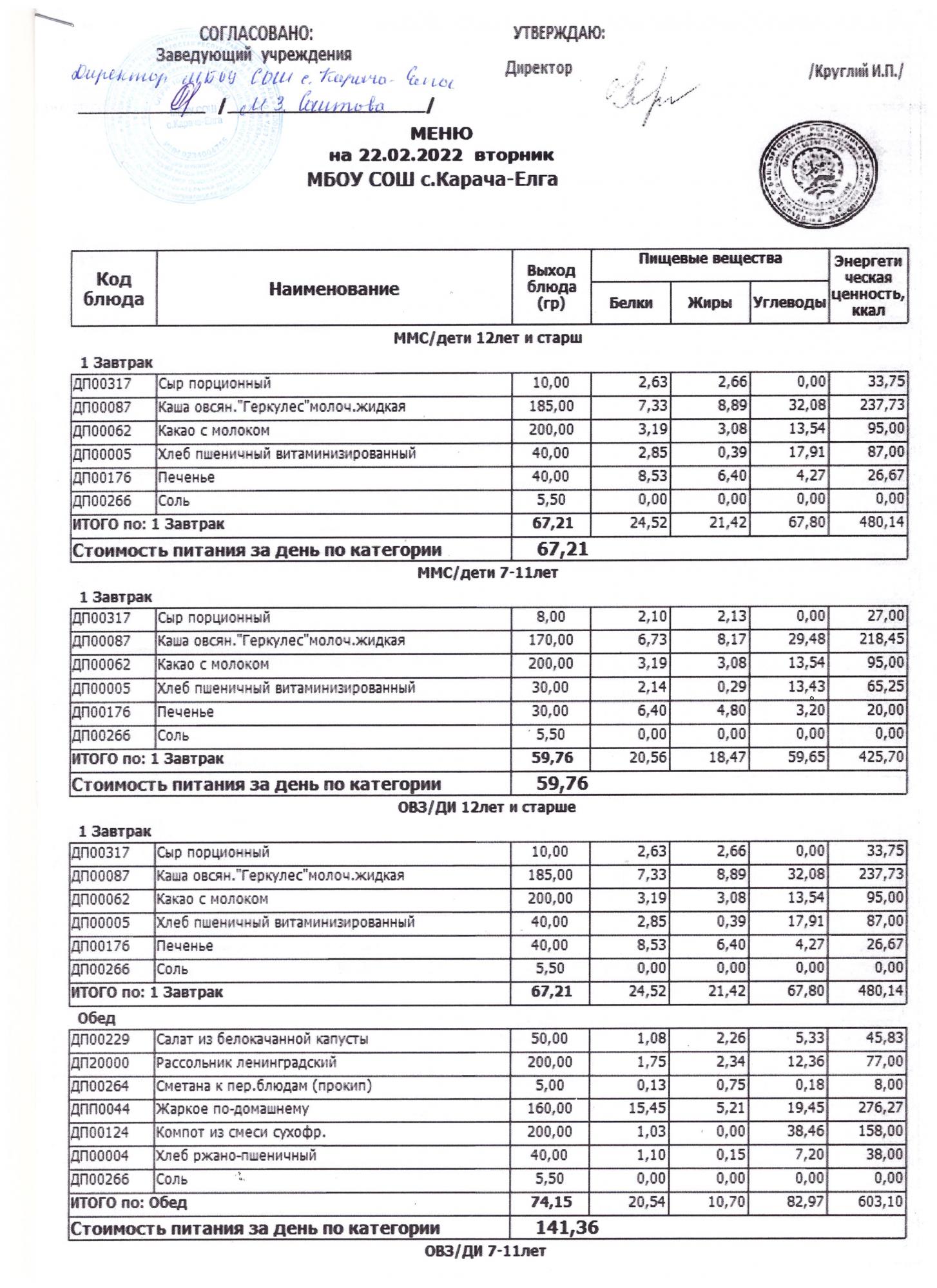 (меню на 22.02.2022 г)