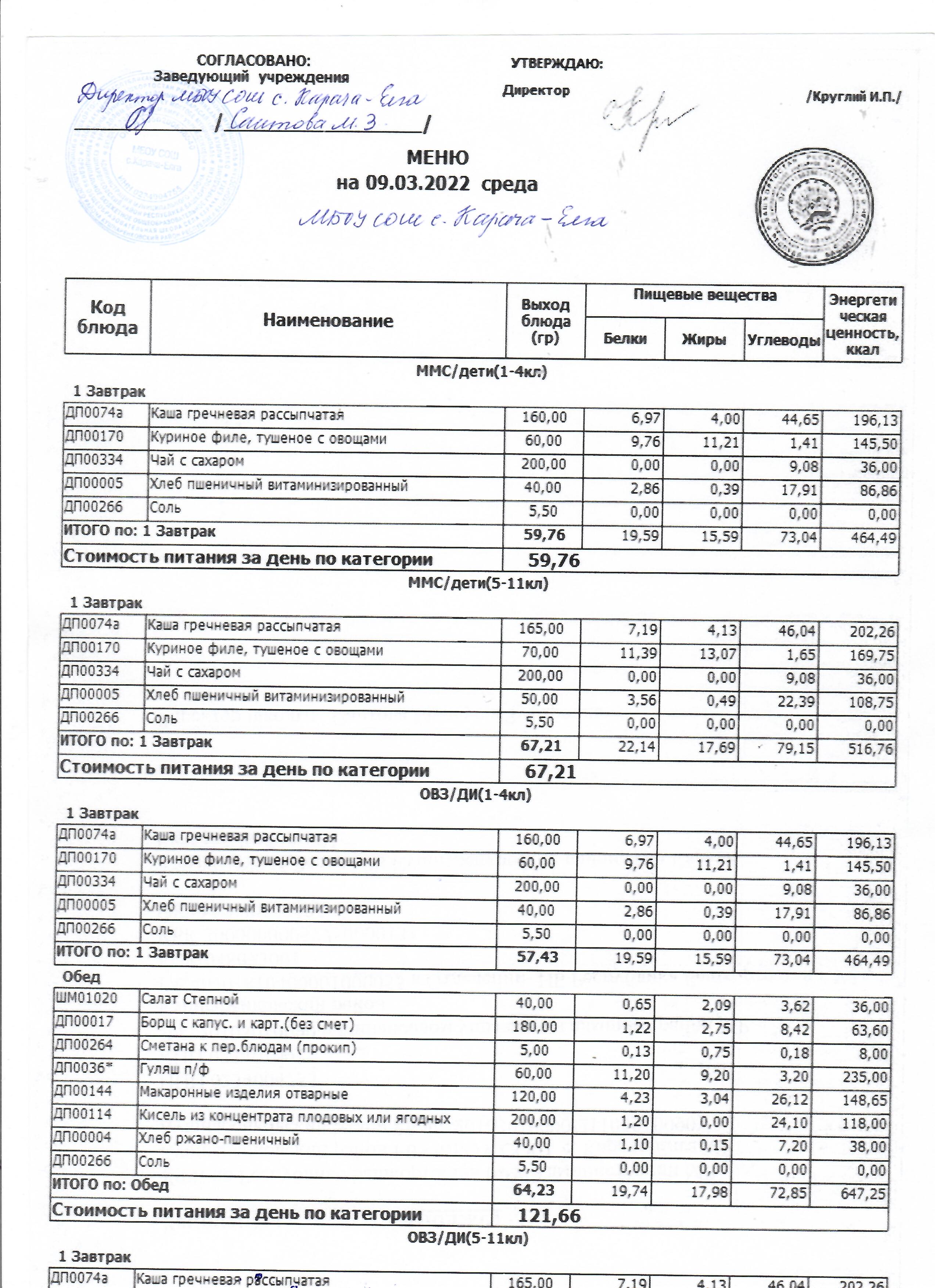 (меню на 09.03.2022 г)