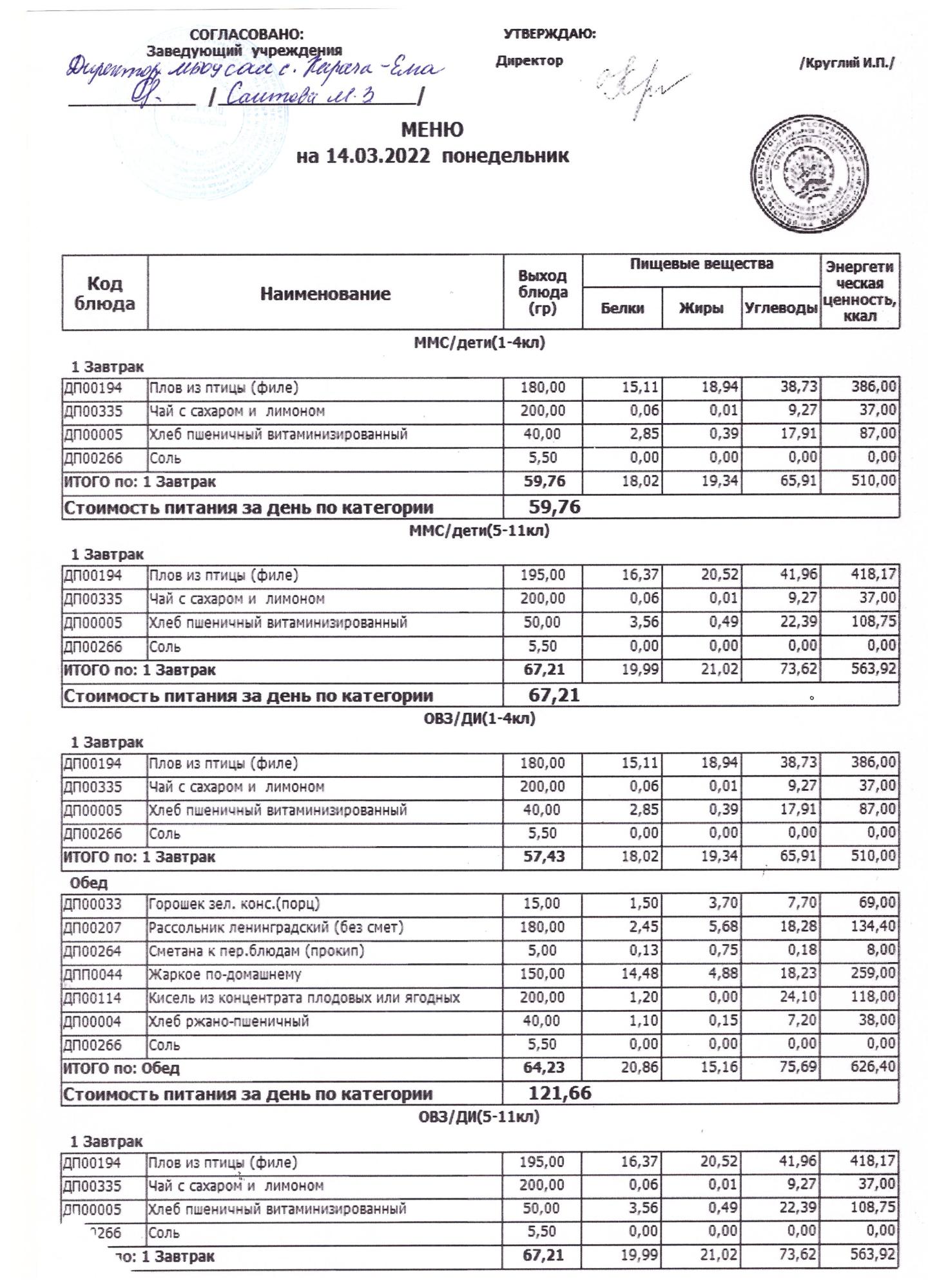 (меню на 14.03.2022 г)