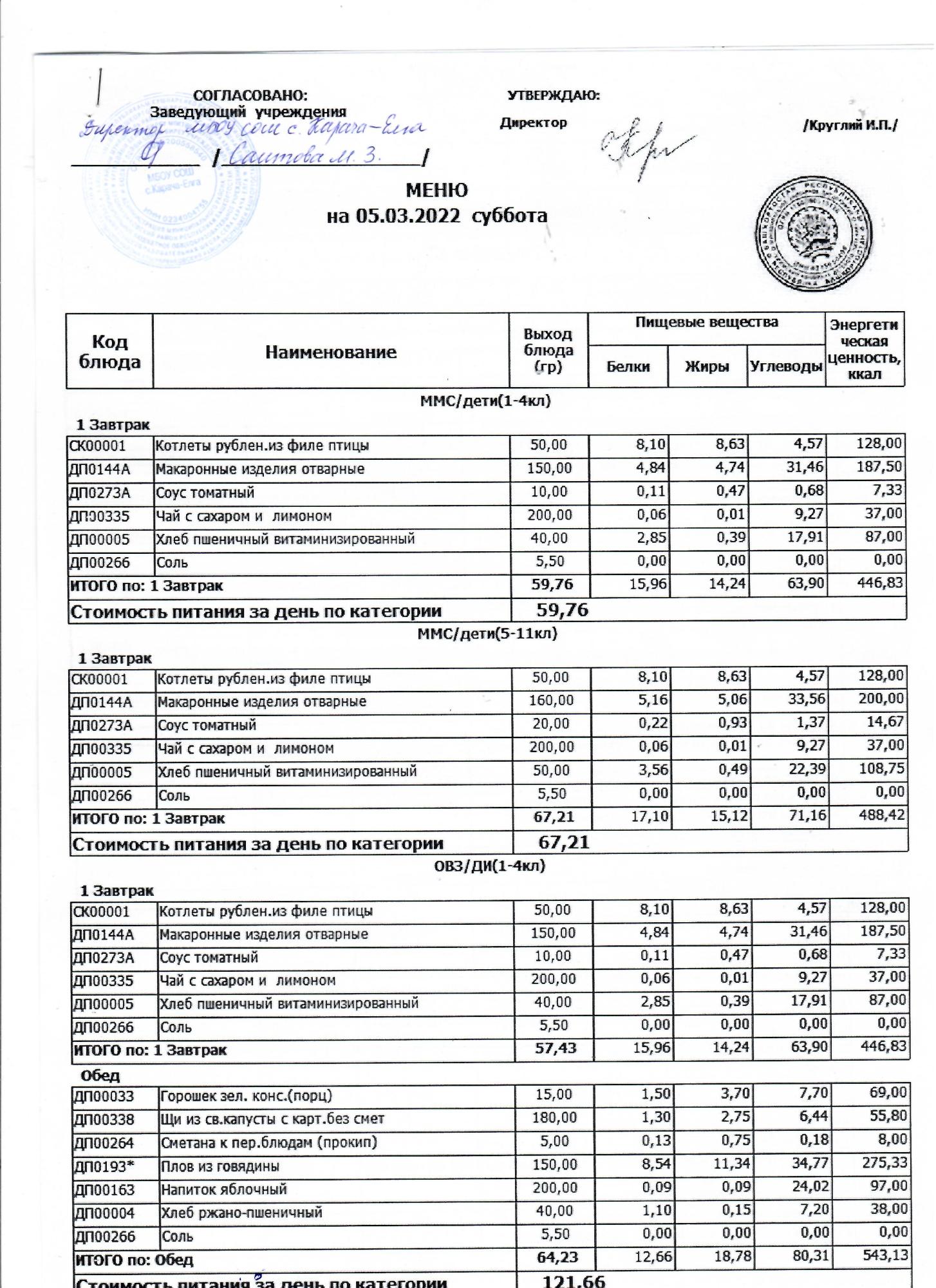 (Меню на 05 марта 2022 г.)