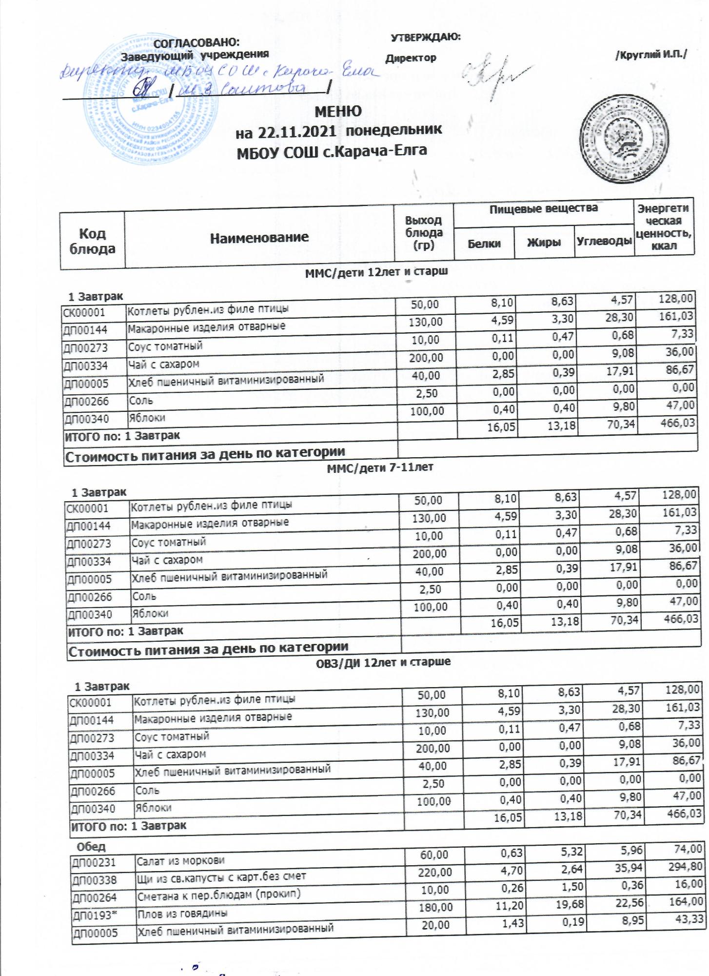 (Меню на 22 ноября 2021 г.)