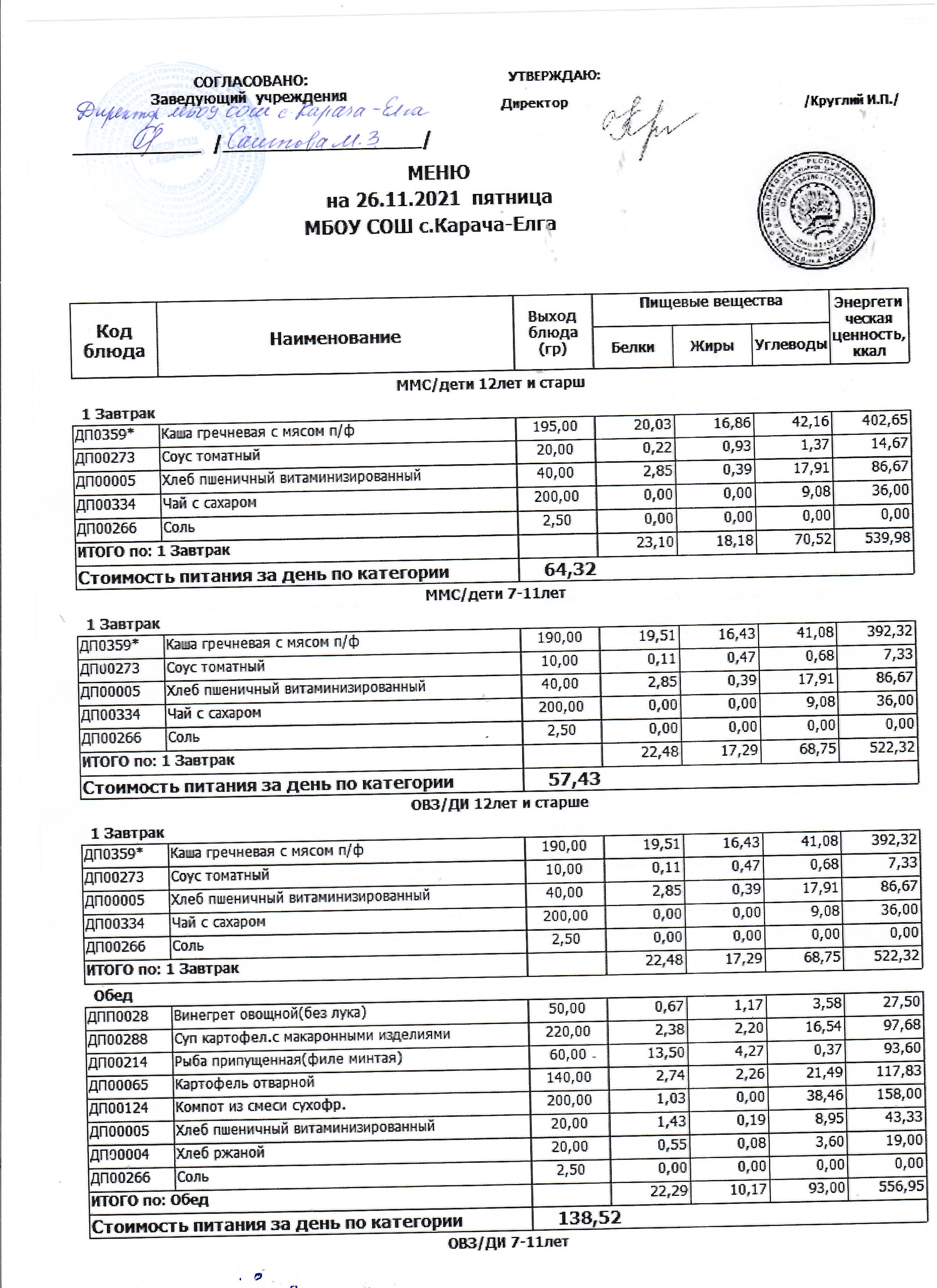 (меню на 26.11.2021 г)